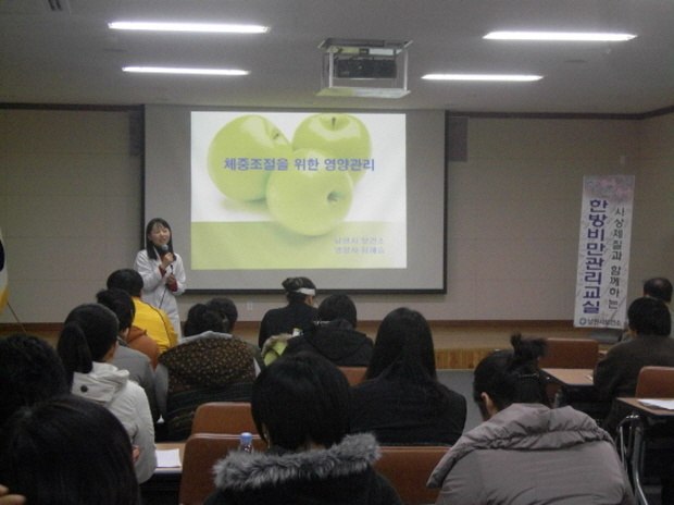 ÀüºÏ´ëÇб³¿Í ³²¿ø½Ã°¡ ÁÖ°üÇÏ¿© ½Ç½ÃÇÑ Áö¿ª»çȸ°Ç°Á¶»ç °á°ú¿¡ µû¸£¸é ³²¿ø½ÃÀÇ ºñ¸¸À²Àº 2009³âµµ 17.6%¿¡¼ 2010³âµµ 21.4%·Î 1³â»çÀÌ 3.8%ÀÇ ³ôÀº Áõ°¡Ãß¼¼¸¦ º¸¿© ÀÌó·³ ºü¸¥ ¼Óµµ·Î ´Ã¾î³ª´Â ºñ¸¸¿¡ ´ëÇÑ ¿¹¹æ ¹× °ü¸®¸¦ À§ÇØ ³²¿ø½Ãº¸°Ç¼Ò´Â Áö³ÇØ 2°³¹Ý¿¡ ÀÌ¾î ¿ÃÇØ¿¡µµ 3°³¹Ý ¿î¿µÀ» °èȹÇÏ¿© ±×Áß Á¦1±â Çѹæºñ¸¸°ü¸®±³½ÇÀ» 1¿ù 9ÀϺÎÅÍ ½ÃÀÛÇÏ¿© 3¿ù 30ÀϱîÁö ÁÖ3ȸ, 3°³¿ù¿¡ °ÉÃÄ ¿î¿µÇÏ¿´´Ù.