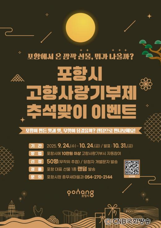 À̹ø À̺¥Æ®´Â Æ÷Ç׽ÿ¡ 10¸¸ ¿ø ÀÌ»ó ±âºÎÇÑ Âü¿©ÀÚ¸¦ ´ë»óÀ¸·Î Çϸç, Ãß÷À» ÅëÇØ 50¸íÀ» ¼±Á¤ÇØ Æ÷Ç× ´ëÇ¥ ¼±¹° 1Á¾À» ·£´ýÀ¸·Î ¹ß¼ÛÇÑ´Ù.