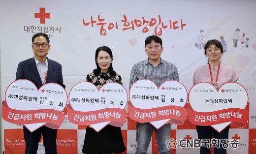 À̳¯ ¢ß´ë¼ºÆÄÀÎÅØ ȸÀåÀÌÀÚ °æ³²Àû½ÊÀÚ»çÀÇ È¸ÀåÀ» ¿ªÀÓÇϰí ÀÖ´Â ¹ÚÈñ¼ø ȸÀå°ú ¢ß´ë¼ºÆÄÀÎÅØ ±è°æÈñ º»ºÎÀå, (ÁÖ)´ë¼ºÆÄÀÎÅØ ±è»óÈ£ Â÷ÀåÀÌ À§±â°¡Á¤À» À§ÇÑ ¼º±ÝÀ» Àü´ÞÇß´Ù.