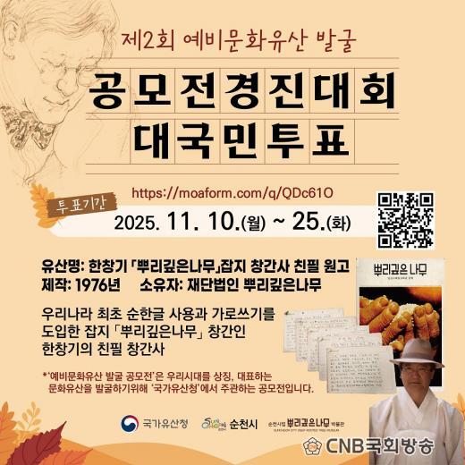 ¼øÃµ½Ã´Â 2024³â ¡®Á¦1ȸ ¿¹ºñ¹®ÈÀ¯»ê ¹ß±¼ °ø¸ðÀü¡¯¿¡¼ 「¹ýÁ¤½º´Ô ºü»ß¿ë ÀÇÀÚ」°¡ ¼±Á¤µÈ ÈÄ, 2ȸÂ÷¿¡¼µµ ÇÑâ±â ¡¸»Ñ¸®±íÀº³ª¹«¡¹ ÀâÁö â°£»ç Ä£ÇÊ¿ø°í°¡ ¼·ù¿Í ¹ßÇ¥½É»ç¸¦ °ÅÃÄ ÃÖÁ¾ È帷Π¼±Á¤µÆ´Ù.