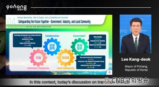 À̰´ö Æ÷Ç×½ÃÀåÀº ¡®A Green Future Emerging from Molten Steel: Pohang Steel, Advancing Beyond Carbon Emission Barriers¡¯(¿ë° ¼Ó¿¡¼ ÇǾ´Â ³ì»ö ¹Ì·¡: ź¼Ò ¹èÃâ À庮À» ³Ñ¾î¼´Â Æ÷Ç× Ã¶°)¶ó´Â ÁÖÁ¦·Î ¾à 15ºÐ°£ ¿µ»ó ¹ßÇ¥¸¦ ÁøÇàÇßÀ¸¸ç, ¹ßÇ¥´Â ¿µ¾î·Î »ó¿µµÅ ±¹Á¦»çȸ °ü°èÀÚµéÀÇ °ü½ÉÀ» ¸ð¾Ò´Ù.