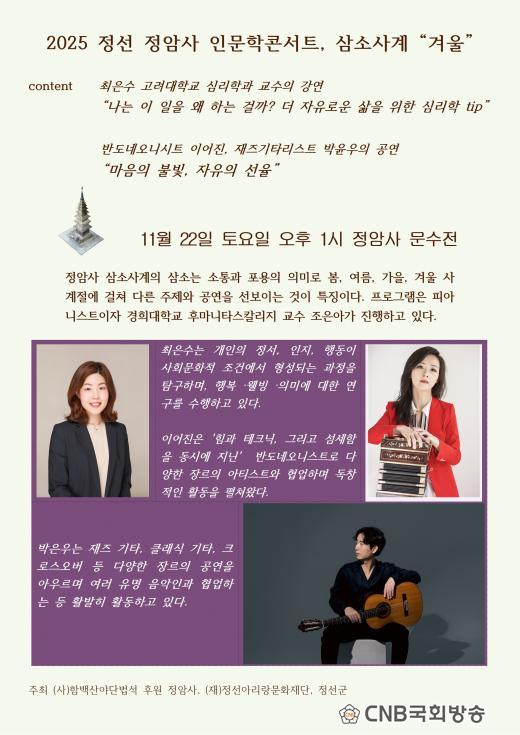 Á¤¾Ï»ç Àι®ÇÐÄܼƮ ¡®»ï¼Ò»ç°è¡¯´Â õ³â °íÂû Á¤¾Ï»ç¿¡¼ ¿ª»ç, ¹®È, »îÀÇ ´Ù¾ç¼ºÀ» ÁÖÁ¦·Î ÇÏ´Â ´ëÁßÀûÀÎ Àι®ÇÐ °¿¬°ú Åä·Ð, üÇè, ±×¸®°í °ÝÁ¶ ³ôÀº °ø¿¬À» ÅëÇØ µ¿ÂüÇÏ´Â À̵鿡°Ô °øµ¿Ã¼ÀÇ °¡Ä¡¿Í ¹Ì·¡¿¡ ´ëÇØ ¼ºÂûÇÒ ±âȸ¸¦ Á¦°øÇÏ´Â Àι® ±³¾ç ÇÁ·Î±×·¥ÀÌ´Ù.