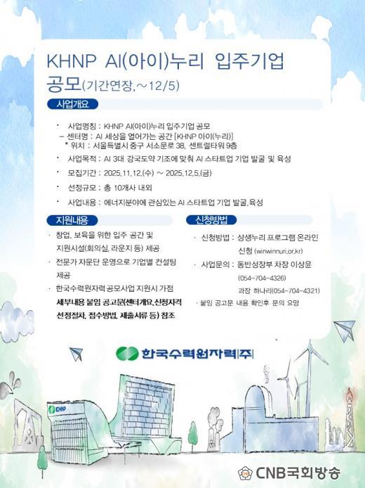 AI ½ºÅ¸Æ®¾÷ ¼ºÀåÀÇ º¸±ÝÀÚ¸®°¡ µÉ ¡®KHNP AI(¾ÆÀÌ) ´©¸®¡¯´Â ³»³â 3¿ù ¼¿ï Áß±¸ ÇѼö¿ø ¹æ»ç¼±º¸°Ç¿ø¿¡ Á¶¼ºµÉ ¿¹Á¤À¸·Î, ÇöÀç ÀÔÁÖ±â¾÷À» °ø°³ ¸ðÁýÇϰí ÀÖ´Ù.