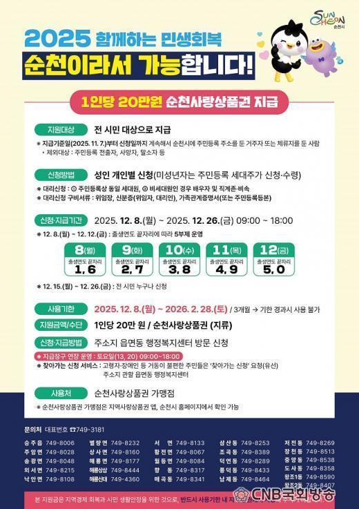 Áö¿ø±ÝÀº Áö±Þ±âÁØÀÏÀÎ 2025³â 11¿ù 7ÀϺÎÅÍ ½ÅûÀϱîÁö °è¼ÓÇØ ¼øÃµ½Ã¿¡ Áֹεî·Ï ÁÖ¼Ò¸¦ µÐ ½Ã¹Î¿¡°Ô 1Àδç 20¸¸ ¿øÀÌ Áö±ÞµÈ´Ù. ¼øÃµ»ç¶û»óǰ±Ç(Áö·ù, 1¸¸ ¿ø±Ç)À¸·Î Áö±ÞµÇ¸ç, »óǰ±ÇÀº 2025³â 12¿ù 8ÀϺÎÅÍ 2026³â 2¿ù 28ÀϱîÁö 3°³¿ù°£ »ç¿ë °¡´ÉÇÏ´Ù.