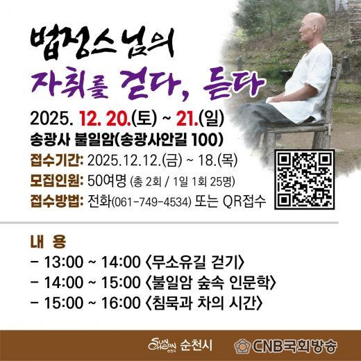À̹ø ÇÁ·Î±×·¥Àº ¹ýÁ¤½º´ÔÀÇ ¼öÇà ÅÍÀüÀ̾ú´ø ºÒÀϾϿ¡¼ ÁøÇàµÇ´Â ½Ã¹Î Âü¿©Çü Àι® ÇÁ·Î±×·¥À¸·Î, ÃÑ 2ȸ(ȸ´ç 25¸í) ¿î¿µÇϸç ÃÑ 50¿© ¸íÀÌ Âü¿©ÇÒ ¼ö ÀÖ´Ù. Á¢¼ö´Â ¿À´Â 18ÀϱîÁö ÀüÈ(061-749-4534) ¶Ç´Â QRÄÚµå·Î ½Åû °¡´ÉÇÏ´Ù.