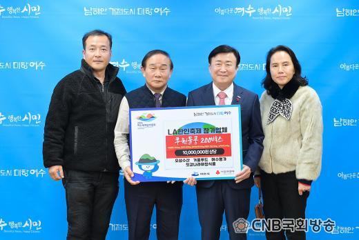 Á¦52ȸ LAÇÑÀÎÃàÁ¦ ¹× ³ó¼ö»ê¹° ¿ì¼ö»óǰ ¿¢½ºÆ÷¿¡ Âü°¡ÇÑ ¿©¼öÁö¿ª 4°³ ¾÷ü°¡ Áö³ 17ÀÏ ¾î·Á¿î ÀÌ¿ôµéÀ» À§ÇØ Á÷Á¢ »ý»ê¡¤°¡°øÇÑ ¸êÄ¡, Á£°¥, ±¼ºñ À徯Âî, °«±èÄ¡·Î ±¸¼ºµÈ õ¸¸ ¿ø »ó´çÀÇ ¹°Ç°À» ¿©¼ö½Ã¿¡ Àü´ÞÇß´Ù.