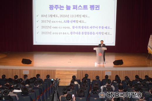 ° ½ÃÀåÀº ƯÈ÷ ±¤ÁÖ¸¦ ¡®ÆÛ½ºÆ® Æë±Ï¡¯¿¡ ºñÀ¯ÇÏ¸ç ¡°±¤ÁÖ´Â ¹ÎÁÖÁÖÀÇ, ÀΰøÁö´É(AI), º¹Áö, À§±â ´ëÀÀ¿¡¼ °¡Àå ¸ÕÀú ºÒÈ®½Ç¼º¿¡ ¶Ù¾îµç µµ½Ã¿´´Ù¡±¸ç ¡°ÇàÁ¤ÅëÇÕ ¿ª½Ã Áö¿ª ÁÖµµ ¼ºÀå ±¹°¡±ÕÇü¹ßÀüÀÇ Ã¹ »ç·Ê¸¦ ¸¸µé¾î³»¾ß ÇÑ´Ù¡±°í ¸»Çß´Ù.