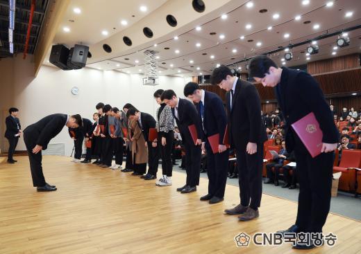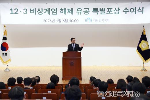 ¿ì¿ø½Ä ±¹È¸ÀÇÀåÀº 6ÀÏ ¿ÀÀü ±¹È¸µµ¼°ü¿¡¼ ¿¸° ¡®12.3 ºñ»ó°è¾ö ÇØÁ¦ À¯°ø Ưº°Æ÷»ó 2Â÷ ¼ö¿©½Ä¡¯À» °³ÃÖÇØ ¼ö»óÀÚµéÀÇ Çå½Å°ú °ø·Î¸¦ Ä¡ÇÏÇß´Ù. À̹ø Æ÷»óÀº ºñ»ó°è¾ö Á¶±â ÇØÁ¦¿¡ ±â¿©ÇßÀ¸³ª Áö³ÇØ 9¿ù 1Â÷ Ưº°Æ÷»ó¿¡ Âü¿©ÇÏÁö ¸øÇÑ ±¹È¸ º¸ÁÂÁø ¹× »ç¹«Ã³ Á÷¿ø µî 440¿©¸íÀ» ´ë»óÀ¸·Î ÁøÇàµÆ´Ù.