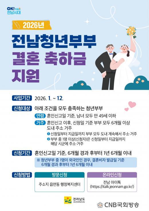 û³âºÎºÎ °áÈ¥ÃàÇÏ±Ý Áö¿ø»ç¾÷Àº Àü³²µµ°¡ 2021³â Àü±¹ ±¤¿ª½Ã¡¤µµ ÃÖÃÊ·Î ½ÃÇàÇß´Ù. Áö¿ø ´ë»óÀº È¥ÀνŰíÀÏ ÇöÀç 49¼¼ ÀÌÇÏ ºÎºÎ´Ù. ½ÅûÀÏ Á÷Àü±îÁö Àü³²¿¡ 6°³¿ù ÀÌ»ó ÁÖ¼Ò¸¦ µÖ¾ß ÇÑ´Ù. È¥ÀνŰí ÈÄ 6°³¿ùÀÌ Áö³ ³¯ºÎÅÍ 1³â 6°³¿ù À̳» ½Åû °¡´ÉÇϸç, ½ÅûÇÑ ´ÞÀÇ ´ÙÀ½ ´Þ 15ÀÏ¿¡ ¹ÞÀ» ¼ö ÀÖ´Ù.