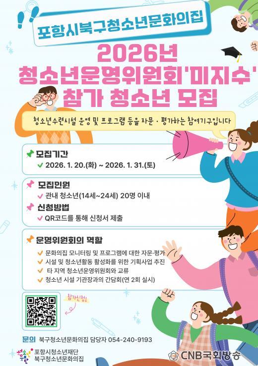 | Æ÷Ç×½Ãû¼Ò³âÀç´Ü, û¼Ò³â¿î¿µÀ§¿øÈ¸ ¡®¹ÌÁö¼ö¡¯ Âü°¡ û¼Ò³â ¸ðÁý - ¿À´Â 20ÀϺÎÅÍ 31ÀϱîÁö Æ÷Ç׽à ³»¿¡ ÁÖ¼ÒÁö¸¦ µÐ Áß¡¤°íµîÇлý 20¸í ³»¿Ü ¼±¹ß CNB±¹È¸¹æ¼Û Àü±¹ÃѰýº»ºÎÀå ±è°Ç¿ì oprus21@naver.com |