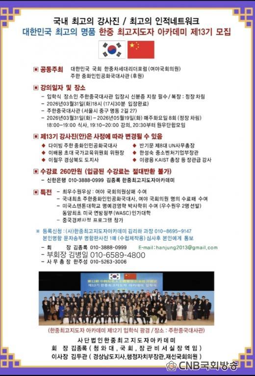 À̹ø 13±â °úÁ¤Àº 2026³â 3¿ù 31ÀÏ ÀÔÇнÄÀ» ½ÃÀÛÀ¸·Î 5¿ù 19ÀϱîÁö ÃÑ 8ȸ¿¡ °ÉÃÄ ÁøÇàµÇ¸ç, ¸ÅÁÖ È¿äÀÏ ÁÖÇÑÁß±¹´ë»ç°ü¿¡¼ Á¤Àå Âø¿ëÀ» ¿øÄ¢À¸·Î ¿î¿µµÈ´Ù. °ÀÇ´Â Àú³á ½Ã°£´ë¿¡ ÁøÇàµÇ¾î °¢°è ¸®´õµéÀÇ Âü¿© ÆíÀǼºÀ» ³ôÀδÙ.