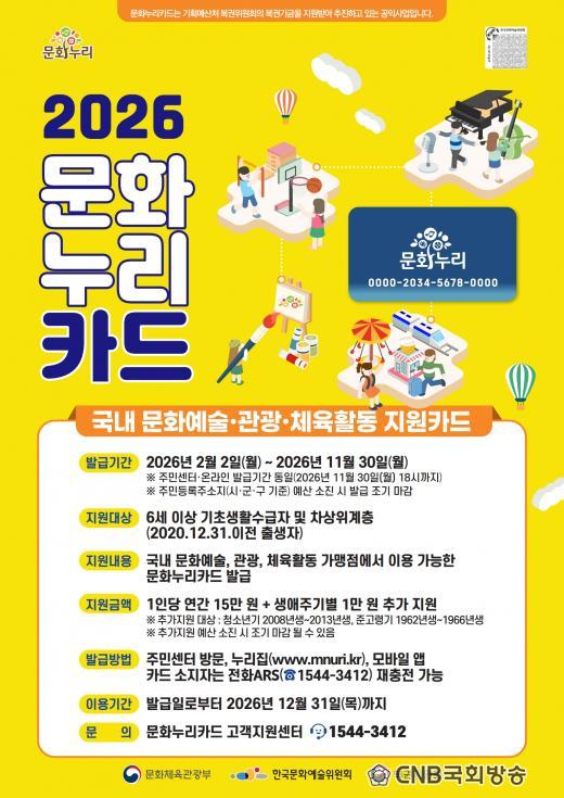 | 2026³â ¹®È´©¸®Ä«µå 15¸¸ ¿ø Áö¿ø, 2¿ù 2ÀϺÎÅÍ ¹ß±Þ - Ãë¾à°èÃþ ÃÑ 270¸¸ ¸í ´ë»ó, Àü³â ´ëºñ 1¸¸ ¿ø ÀλóÇÑ 15¸¸ ¿ø Áö¿ø - û¼Ò³â(13¡18¼¼), »ý¾ÖÀüȯ±â(60¡64¼¼) ´ë»óÀÚ 1¸¸ ¿ø Ãß°¡, 16¸¸ ¿ø Áö¿ø CNB±¹È¸¹æ¼Û È£³²º»ºÎÀå ¿À°æÅ okt0797@naver.com |