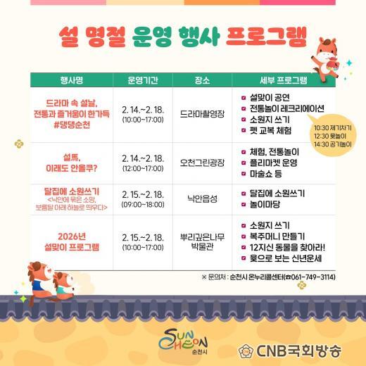 ¼³ ¿¬ÈÞ ±â°£ ¼øÃµ½Ã´Â ¼øÃµ¸¸±¹°¡Á¤¿ø, ¼øÃµ¸¸½ÀÁö, µå¶ó¸¶ÃÔ¿µÀå, ¼øÃµ ³«¾ÈÀ¾¼º, »Ñ¸®±íÀº³ª¹«¹Ú¹°°ü µî Á÷¿µ °ü±¤½Ã¼³ 5°÷À» Á¤»ó ¿î¿µÇÑ´Ù. ¶ÇÇÑ 2¿ù 16ÀϺÎÅÍ 18ÀϱîÁö ÇѺ¹À» Âø¿ëÇÑ °ü±¤°´¿¡°Ô ¹«·á ÀÔÀå ÇýÅÃÀ» Á¦°øÇØ ¸íÀý ºÐÀ§±â¸¦ ´õÇÒ ¿¹Á¤ÀÌ´Ù.