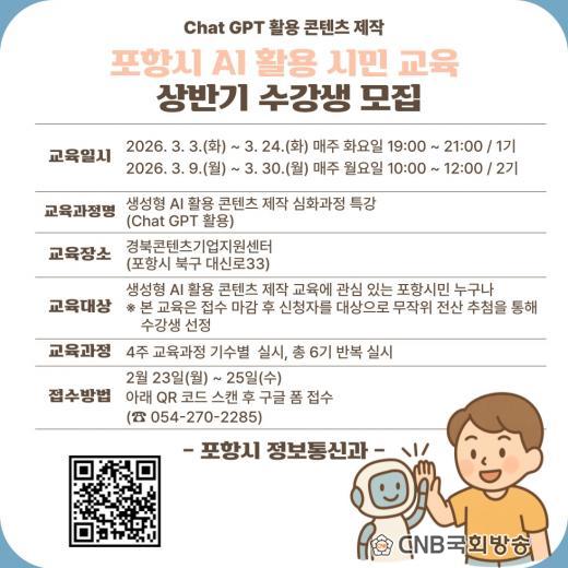 | Æ÷Ç×½Ã, 2026³â »ó¹Ý±â »ý¼ºÇü AI Ư° ¿î¿µ...¡®½Ã¹Î ´©±¸³ª AI Ȱ¿ë ½Ã´ë¡¯ - 2025³â ³ôÀº ¸¸Á·µµ À̾î 2026³â¿¡µµ ½Ã¹Î ´ë»ó AI ½Ç½À Ư° ÃßÁø - 2¿ù 23ÀϺÎÅÍ 1¡¤2±â ¼ö°»ý 40¸í ¸ðÁý¡¦Á÷ÀåÀÎÀ» À§ÇÑ ¾ß°£ Ư° Æ÷ÇÔ CNB±¹È¸¹æ¼Û Àü±¹ÃѰýº»ºÎÀå ±è°Ç¿ì oprus21@naver.com |