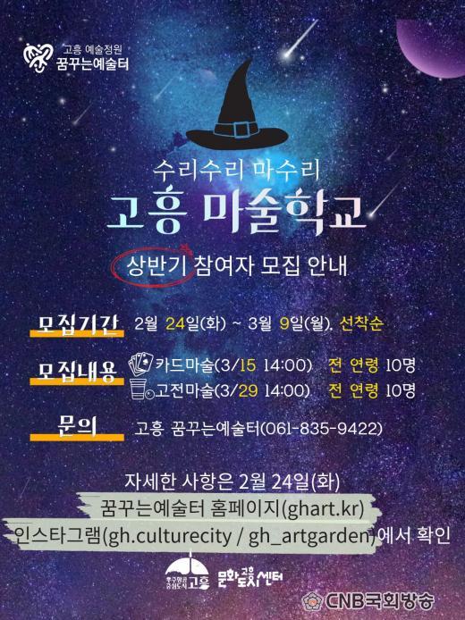 | °íÈﱺ, À¶º¹ÇÕ ¹®È¿¹¼ú±³À° ¡¸°íÈï ¸¶¼úÇб³¡¹ Âü¿©ÀÚ ¸ðÁý -2¿ù 24ÀϺÎÅÍ ¸ðÁý¡¦ Àü ¿¬·É ´ë»ó üÇèÇü ¸¶¼ú±³À° ¿î¿µ CNB±¹È¸¹æ¼Û È£³²º»ºÎÀå ¿À°æÅ okt0797@naver.com |