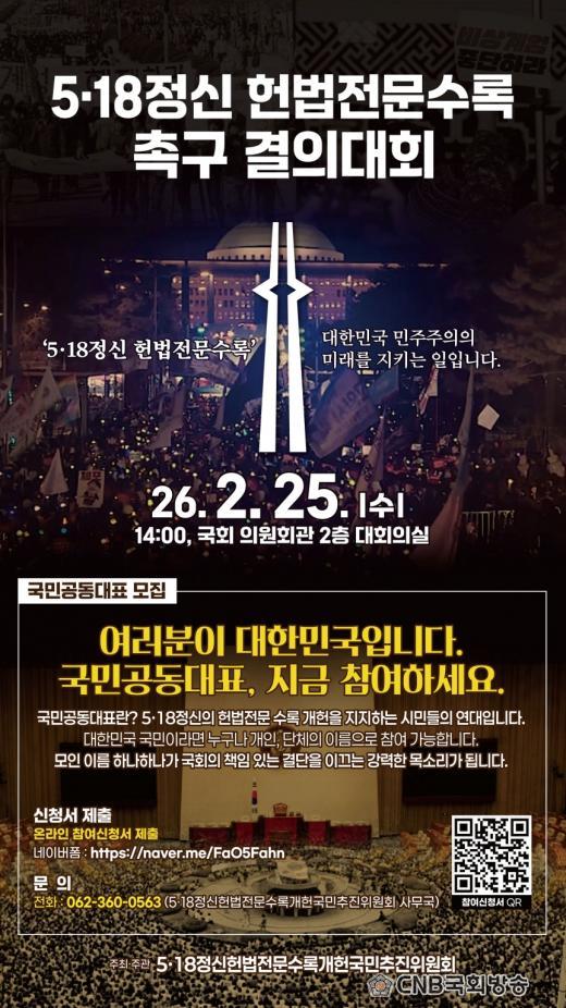 À̳¯ ±¹¹Î°áÀÇ´ëȸ´Â ¡®5¡¤18 Çå¹ýÀü¹® ¼ö·Ï °³Çå ±¹¹ÎÃßÁøÀ§¿øÈ¸¡¯(ÀÌÇÏ ÃßÁøÀ§¿øÈ¸)·Î ÁÖÃÖ·Î ¿¸®¸ç, ÃßÁøÀ§´Â 5¡¤18Á¤½Å Çå¹ýÀü¹® ¼ö·Ï¿¡ Âù¼ºÇÏ´Â ±¹¹Î ´©±¸³ª Âü¿©ÇÒ ¼ö ÀÖµµ·Ï °ø°³ ¸ðÁý ¹æ½ÄÀ¸·Î ±¸¼ºµÆÀ¸¸ç, ÇöÀç±îÁö 231°³ ±â°ü¡¤´Üü µîÀÌ ÇÔ²²Çϰí ÀÖ´Ù.
