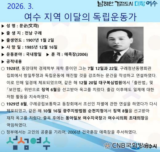 ÇÑÆí, ¿©¼ö½Ã´Â 2022³â 8¿ùºÎÅÍ ¿©¼öÁö¿ªµ¶¸³¿îµ¿°¡À¯Á·È¸¿Í ÇÔ²² Áö¿ª Ãâ½Å µ¶¸³¿îµ¿°¡¸¦ ¸Å´Þ ¼±Á¤¡¤È«º¸Çϰí ÀÖÀ¸¸ç, ÇöÀç±îÁö ÃÑ 85¸íÀÇ µ¶¸³¿îµ¿°¡¸¦ Ãß¼Çß´Ù.