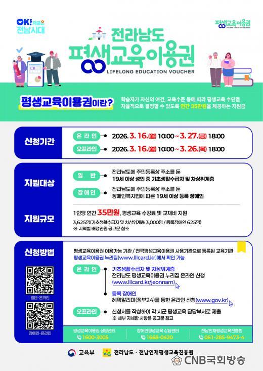 Àü¶ó³²µµ¿Í Àü³²ÀÎÀçÆò»ý±³À°ÁøÈï¿øÀº ¿À´Â 27ÀϱîÁö ¡®2026 Àü¶ó³²µµ Æò»ý±³À°ÀÌ¿ë±Ç¡¯ 1Â÷ ½ÅûÀ» ¹Þ´Â´Ù°í ¹àÇû´Ù. À̹ø »ç¾÷Àº »çȸ¡¤°æÁ¦Àû ¿©°Ç¿¡ µû¸¥ ±³À° Âü¿© °ÝÂ÷¸¦ ÁÙÀÌ°í µµ¹ÎÀÇ ÇнÀ ±âȸ¸¦ È®´ëÇϱâ À§ÇØ ¸¶·ÃµÆ´Ù.
