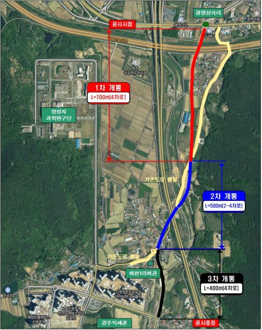 9ÀÏ ±¤¸í»ï°Å¸®~Á¦1Èõ±³ 700m ±¸°£ÀÌ 1Â÷ °³ÅëµÇ°í, ´ÙÀ½´Þ 12ÀÏ Á¦1Èõ±³~Èõ1¸®È¸°ü 500m ±¸°£ÀÌ Ãß°¡ °³ÅëµÈ´Ù. 6¿ù 30ÀÏ ÀÜ¿© 400m±îÁö ¿¬°áµÇ¸é Àü ±¸°£ 1.6§°°¡ ¿ÏÀü °³ÅëµÈ´Ù.