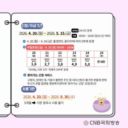 Áö±Þ±â°£Àº 4¿ù 20ÀϺÎÅÍ 5¿ù 15ÀϱîÁöÀ̸ç, ½Åû ù ÁÖ¿¡´Â Ãâ»ý¿¬µµ ³¡ÀÚ¸®¿¡ µû¸¥ ¿äÀÏÁ¦¸¦ Àû¿ëÇÑ´Ù. ´Ù¸¸, ½Ã¹Î ÆíÀǸ¦ À§ÇØ 4¿ù 25ÀÏ(Åä)Àº ÁÖ¸»¿¡µµ ½Åû ⱸ¸¦ ¿î¿µÇϸç, À̳¯¿¡´Â ¿äÀÏÁ¦ ¿î¿µ°ú °ü°è¾øÀÌ ´©±¸³ª ½ÅûÀÌ °¡´ÉÇÏ´Ù. ¶ÇÇÑ 4¿ù 27ÀϺÎÅÍ´Â Àü ½Ã¹Î ´©±¸³ª ÀÚÀ¯·Ó°Ô ½ÅûÇÒ ¼ö ÀÖ´Ù.