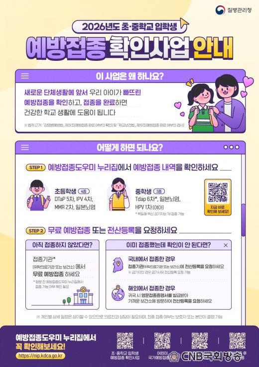 ÃʵîÇб³ ÀÔÇÐ Àü¿¡´Â ÀϺ»³ú¿°À» Æ÷ÇÔÇØ DTaP 5Â÷, Æú¸®¿À 4Â÷, MMR 2Â÷ µî 4Á¾ Á¢Á¾À» ¸¶ÃÄ¾ß ÇÑ´Ù. ÁßÇб³ ÀÔÇÐ Àü¿¡´Â ÀϺ»³ú¿°°ú Tdap 6Â÷, HPV 1Â÷(¿©Çлý) Á¢Á¾À» ¿Ï·áÇØ¾ß ÇÑ´Ù.