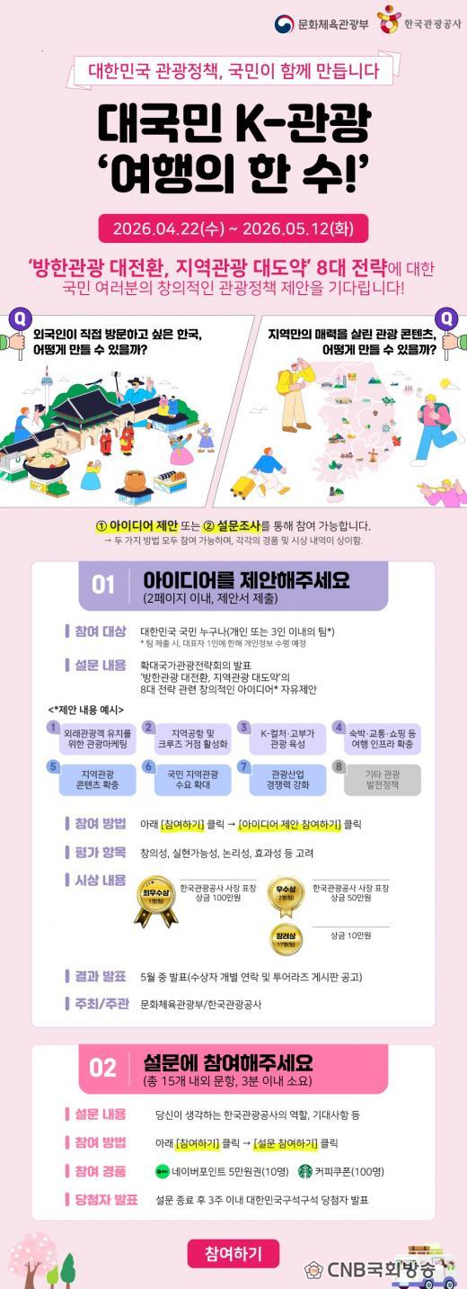 ¹®Ã¼ºÎ´Â Á¦µµ °³Æí°ú ÇÔ²² ±¹¹Î Âü¿©Çü Á¤Ã¥ ¹ß±¼¿¡µµ ³ª¼±´Ù. 4¿ù 22ÀϺÎÅÍ 5¿ù 12ÀϱîÁö °ü±¤Á¤Ã¥ ±¹¹ÎÁ¦¾È °ø¸ðÀüÀ» ¿¾î ¹æÇѰü±¤ ´ëÀüȯ°ú Áö¿ª°ü±¤ ´ëµµ¾àÀ» Áß½ÉÀ¸·Î ÇÑ 8°³ ºÐ¾ß ¾ÆÀ̵ð¾î¸¦ ¸ðÁýÇÑ´Ù.