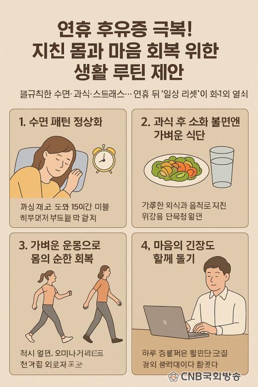 | ¿¬ÈÞ ÈÄÀ¯Áõ ±Øº¹! ÁöÄ£ ¸ö°ú ¸¶À½ ȸº¹ À§ÇÑ »ýȰ ·çƾ Á¦¾È  -ºÒ±ÔÄ¢ÇÑ ¼ö¸é¡¤°ú½Ä¡¤½ºÆ®·¹½º¡¦ ¿¬ÈÞ µÚ ¡®ÀÏ»ó ¸®¼Â¡¯ÀÌ È¸º¹ÀÇ ¿¼è CNB±¹È¸¹æ¼Û È£³²ÃѰýº»ºÎÀå ¿À°æÅ okt0797@naver.com  |