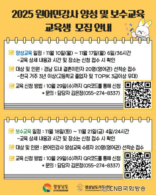 À̹ø ±³À°Àº 11¿ù 10ÀϺÎÅÍ 21ÀϱîÁö µµ³» °áÈ¥À̹ÎÀÚ 20¸í°ú ±âÁ¸ ¼ö·áÀÚ 20¸íÀ» ´ë»óÀ¸·Î ÃÑ 60½Ã°£ °úÁ¤À¸·Î ÁøÇàÇϸç, °áÈ¥À̹ÎÀÚ¸¦ ¿ø¾î¹Î°»ç·Î ¾ç¼ºÇÏ¿© »çȸÂü¿©¸¦ Ȱ¼ºÈÇϰí, ±âÁ¸ °»çÀÇ ¿ª·® °È ¹× Àü¹®¼º Çâ»óÀ» À§ÇØ ½Ç½ÃµÈ´Ù.