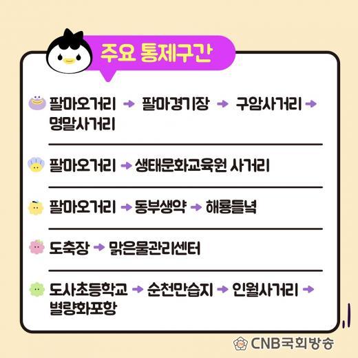 ´ëȸ ´çÀÏÀÎ ¿ÀÀü 8½ÃºÎÅÍ ¿ÀÈÄ 1½Ã 30ºÐ±îÁö ¸¶¶óÅæ ÄÚ½º ÁÖ¿ä µµ·Î¿¡¼ ±³ÅëÀÌ ÅëÁ¦µÈ´Ù. ÆÈ¸¶¿À°Å¸®¿¡¼ ÆÈ¸¶Á¾ÇտÀå°ú ¼øÃµ¸¸±¹°¡Á¤¿ø ¹æÇâ ÁøÀÔÀÌ ±ÝÁöµÇ¸ç, »ýŹ®È±³À°¿ø¿¡¼ ¸¼Àº¹°°ü¸®¼¾ÅÍ ±¸°£Àº Àü¸é ÅëÁ¦, µµ»çÃʵîÇб³¿¡¼ Àοù»ç°Å¸® ¹æÇâÀº ÀϹæÅëÇàÀ¸·Î ¿î¿µµÈ´Ù.