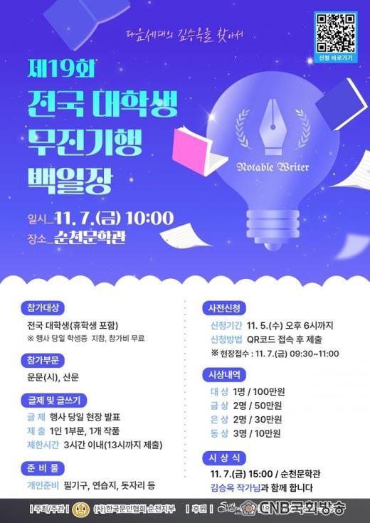| ¼øÃµ¹®ÀÎÇùȸ, Á¦19ȸ Àü±¹´ëÇлý ¹«Áø±âÇà ¹éÀÏÀå °³ÃÖ - ±è½Â¿Á ÀÛ°¡ÀÇ ¹®ÇРȥÀ» ÀÕ´Â ÀþÀº âÀÛÀÇ ¹«´ë - CNB ±¹È¸¹æ¼Û ¼øÃµ½ÃÃëÀ纻ºÎ ±è±¤¿øº»ºÎÀå cnbnews3000@naver.com |