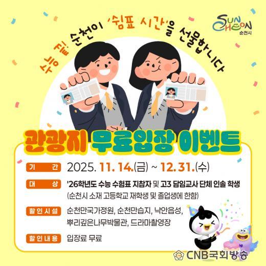 | ¼øÃµ½Ã, ¼öÇèÇ¥ ÇÑ ÀåÀ¸·Î ¼øÃµ ´ëÇ¥ °ü±¤Áö ¹«·áÀÔÀå - 11¿ù 14ÀÏ ~ 12¿ù 31ÀÏ, ¼öÇè»ý ¿©·¯ºÐÀÇ ¡®½°Ç¥¡¯ ½Ã°£À» ¼øÃµÀÌ ÀÀ¿øÇÕ´Ï´Ù - CNB ±¹È¸¹æ¼Û ¼øÃµ½ÃÃëÀ纻ºÎ ±è±¤¿øº»ºÎÀå kimcnbnews3000@naver.com |