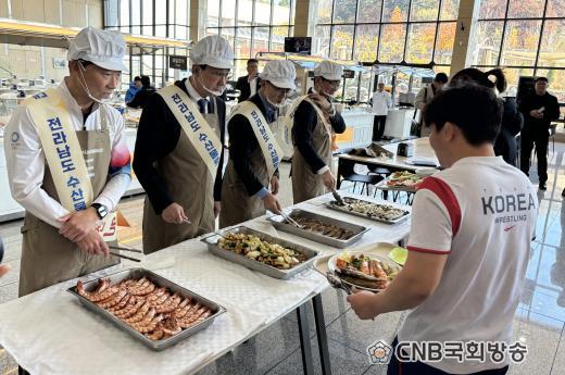 Çà»ç¿¡¼± Àüº¹, ±¼ºñ, Àå¾î, ¹Î¾î, ±¼, ¹®¾î µî Áö¿ªÀ» ´ëÇ¥ÇÏ´Â °íǰÁú ¼ö»ê¹°À» Ȱ¿ëÇÑ Æ¯½Ä 500ÀκÐÀÌ Á¦°øµÆ´Ù. ¼±¼ö´ÜÀÇ Ã¼·Â ÁõÁø°ú °Ç°ÇÑ ½Ä´ÜÀ» À§ÇØ ´Ü¹éÁú°ú ¹Ì³×¶öÀÌ Ç³ºÎÇÑ Àü³² ¼ö»ê¹°À» Áß½ÉÀ¸·Î ´Ù¾çÇÑ ¸Þ´º°¡ ±¸¼ºµÅ ¡®Ã»Á¤ Àü³² ¼ö»ê¹°ÀÇ Ç⿬¡¯À̶ó¸ç ¼±¼ö´ÜÀÇ Å« È£ÀÀÀ» ¾ò¾ú´Ù.