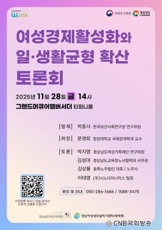 °æ³²µµ°¡ ÁÖÃÖÇÏ°í °æ³²¿©¼º»õ·ÎÀÏÇϱ⼾ÅÍ(ÀÌÇÏ °æ³²»õÀϼ¾ÅÍ)°¡ ÁÖ°üÇÏ´Â À̹ø Åä·Ðȸ´Â ¿©¼º °æÁ¦È°µ¿ Ȱ¼ºÈ¿Í ÀÏ¡¤»ýȰ±ÕÇü ¹®È È®»ê¿¡ ´ëÇÑ Áö¿ª»çȸ ºÐÀ§±â¸¦ Á¶¼ºÇϰíÀÚ ¸¶·ÃµÆ´Ù.