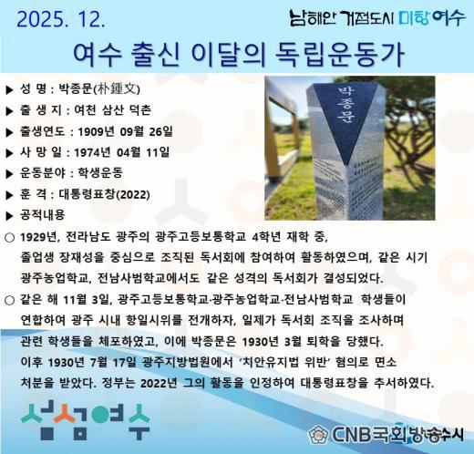 | ¿©¼ö½Ã, 2025³â 12¿ùÀÇ µ¶¸³¿îµ¿°¡ ¡®¹ÚÁ¾¹®(ÚÓñ£Ùþ)¡¯ ¼±»ý ¼±Á¤ -Á¤ºÎ´Â 2022³â ±×ÀÇ È°µ¿À» ÀÎÁ¤ÇØ ´ëÅë·É ǥâÀ» Ãß¼ CNB±¹È¸¹æ¼Û È£³²º»ºÎÀå ¿À°æÅ okt0797@naver.com |