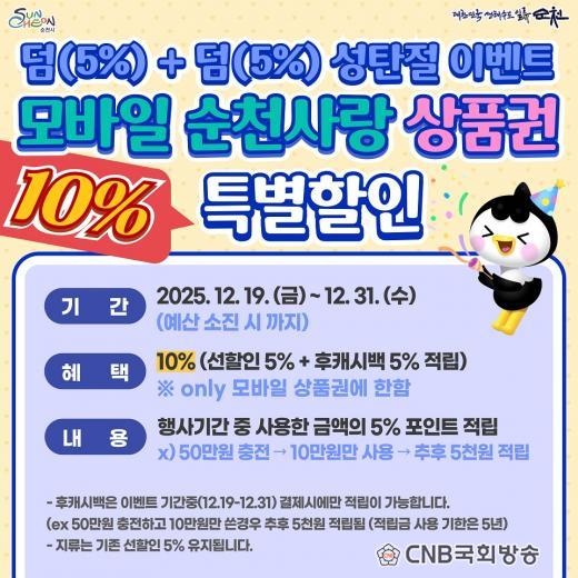 | ¡°´ý(5%)+´ý(5%) ¼ºÅºÀý À̺¥Æ®¡± ¸ð¹ÙÀÏ ¼øÃµ»ç¶û»óǰ±Ç Ưº° ÇÒÀÎ - ¸ð¹ÙÀÏ ¼øÃµ»ç¶û»óǰ±Ç ÃÑ 10% Ưº° ÇÒÀΡ¦¿¬¸» Áö¿ª°æÁ¦¿¡ ¿Â±â ´õÇØ - CNB ±¹È¸¹æ¼Û ¼øÃµ½ÃÃëÀ纻ºÎ ±è±¤¿øº»ºÎÀå cnbnews3000@naver.com |