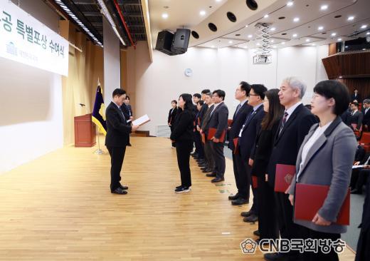 ¿ì¿ø½Ä ±¹È¸ÀÇÀåÀº 6ÀÏ ¿ÀÀü ±¹È¸µµ¼°ü¿¡¼ ¿¸° ¡®12.3 ºñ»ó°è¾ö ÇØÁ¦ À¯°ø Ưº°Æ÷»ó 2Â÷ ¼ö¿©½Ä¡¯À» °³ÃÖÇØ ¼ö»óÀÚµéÀÇ Çå½Å°ú °ø·Î¸¦ Ä¡ÇÏÇß´Ù. À̹ø Æ÷»óÀº ºñ»ó°è¾ö Á¶±â ÇØÁ¦¿¡ ±â¿©ÇßÀ¸³ª Áö³ÇØ 9¿ù 1Â÷ Ưº°Æ÷»ó¿¡ Âü¿©ÇÏÁö ¸øÇÑ ±¹È¸ º¸ÁÂÁø ¹× »ç¹«Ã³ Á÷¿ø µî 440¿©¸íÀ» ´ë»óÀ¸·Î ÁøÇàµÆ´Ù.
