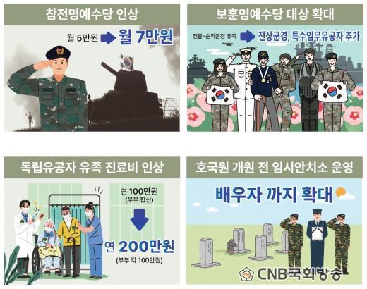 ÀÌ¿¡ µû¶ó 6¡¤25ÀüÀï°ú ¿ù³²Àü ÂüÀüÀ¯°øÀÚÀÇ ¸í¿¹¸¦ ±â¸®°í »ýȰ ¾ÈÁ¤À» µ½±â À§ÇØ ÂüÀü¸í¿¹¼ö´çÀ» ¿ù 5¸¸ ¿ø¿¡¼ 7¸¸ ¿øÀ¸·Î ÀλóÇÑ´Ù. ´Ü°èÀû ÀλóÀ» ÅëÇØ °í·ÉÀÇ ÂüÀüÀ¯°øÀÚ°¡ º¸´Ù ¾ÈÁ¤Àû »ýȰÀ» À̾µµ·Ï Áö¿øÇϱâ À§ÇÑ Á¶Ä¡´Ù.