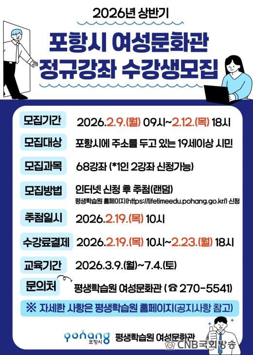 ¼ö° ½ÅûÀº ¿À´Â 6ÀÏ ¼ö°·á ¸éÁ¦ÀÚ¸¦ ´ë»óÀ¸·Î ÇÑ ¿ì¼± ¸ðÁýÀ» ½ÃÀÛÀ¸·Î, 2¿ù 9ÀϺÎÅÍ 12ÀϱîÁö Æ÷Ç׽à Æò»ýÇнÀ¿ø ȨÆäÀÌÁö(http://lifetimeedu.pohang.go.kr)¸¦ ÅëÇØ ¿Â¶óÀÎÀ¸·Î ÁøÇàµÈ´Ù. ¿ì¼± ¸ðÁýÀº Á¤¿øÀÇ 10% À̳»¿¡¼ ¼±Âø¼øÀ¸·Î Á¢¼öÇϸç, ±³À° ±â°£Àº 2026³â 3¿ù 9ÀϺÎÅÍ 7¿ù 4ÀϱîÁö ÃÑ 16ÁÖ°£ ¿î¿µµÈ´Ù.