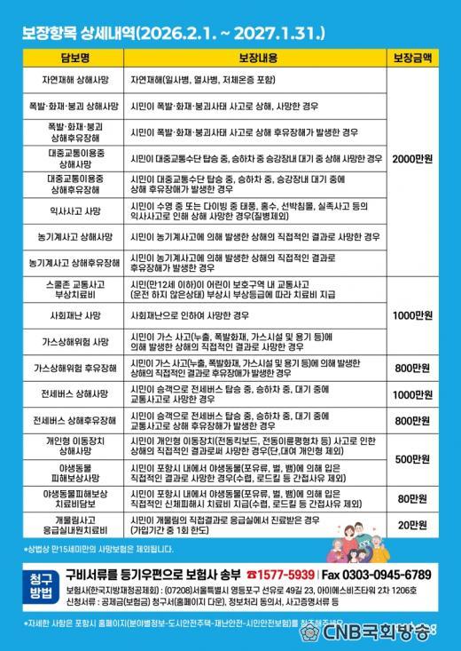 | Æ÷Ç×½Ã, ½Ã¹Î¾ÈÀüº¸Çè È®´ë °³Æí ¡¦ ÀÏ»ó ¼Ó »ç°í º¸Àå °È - º°µµ ÀýÂ÷ ¾øÀÌ Àü ½Ã¹Î ÀÚµ¿ °¡ÀÔ À¯Áö, º¸Àå Ç׸ñ 14°³¿¡¼ 18°³·Î È®´ë - »ç°í ¹ß»ý ÈÄ 3³â À̳» º¸Çè±Ý û±¸ °¡´É, ÃÖ´ë 2õ¸¸ ¿ø º¸Àå CNB±¹È¸¹æ¼Û Àü±¹ÃѰýº»ºÎÀå ±è°Ç¿ì oprus21@naver.com |