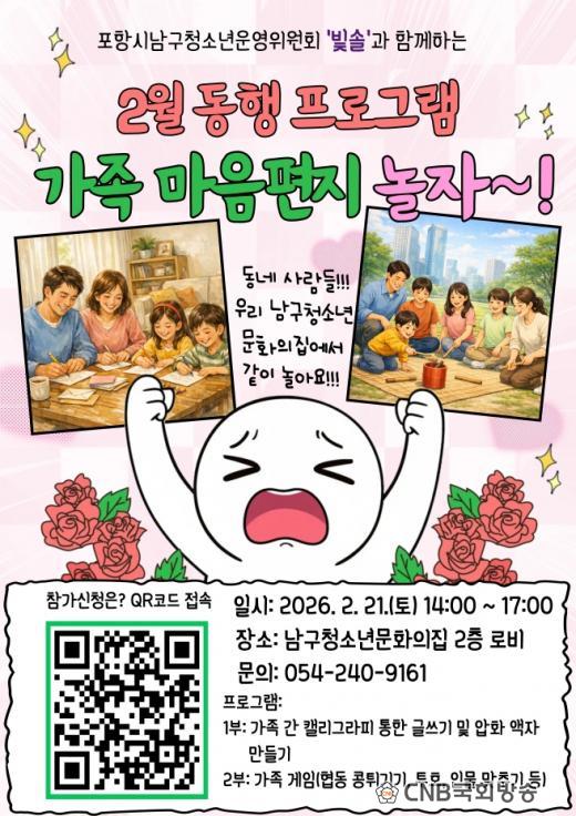 ¿À´Â 21ÀÏ ³²±¸Ã»¼Ò³â¹®ÈÀÇÁý 2Ãþ ·Îºñ¿¡¼ ¿ÀÈÄ 2½ÃºÎÅÍ 5½Ã±îÁö ÁøÇàµÇ¸ç, û¼Ò³â Àڳฦ µÐ 10°¡Á·À» ¼±Âø¼ø ¸ðÁýÇÑ´Ù. Âü°¡½ÅûÀº ³²±¸Ã»¼Ò³â¹®ÈÀÇÁý °ø½Ä ÀνºÅ¸±×·¥ ä³Î ¹× Æ÷Ç×½Ãû¼Ò³âÀç´Ü °øÁö»çÇ×¶õ¿¡¼ È«º¸Æ÷½ºÅÍ ¼Ó QRÄڵ带 ÅëÇØ ¼Õ½±°Ô ½ÅûÇÒ ¼ö ÀÖ´Ù.