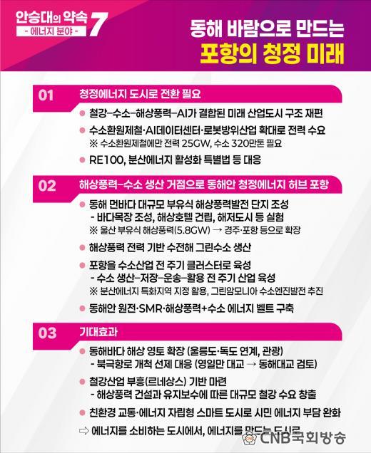 ¶ÇÇÑ, ÇØ»ódz·Â Àü·ÂÀ» Ȱ¿ëÇÑ ¼öÀüÇØ ¹æ½ÄÀÇ ±×¸°¼ö¼Ò »ý»êÀ» ÅëÇØ Àç»ý¿¡³ÊÁöÀÇ °£Ç漺 ¹®Á¦¸¦ ±Øº¹Çϰí, Æ÷Ç×À» Àü±â¸¦ »ý»êÇÏ°í ¿¡³ÊÁö¸¦ ÀúÀ塤°ø±ÞÇÏ´Â µµ½Ã·Î µµ¾à½ÃŰ°Ú´Ù°í ¹àÇû´Ù. ±×´Â ¡°µ¿ÇØ¾È ¿øÀü¡¤SMR¡¤ÇØ»ódz·Â°ú ¼ö¼Ò¸¦ °áÇÕÇÑ ¿¡³ÊÁö º§Æ®¸¦ ±¸ÃàÇØ Æ÷Ç×À» ´ëÇѹα¹ ûÁ¤¿¡³ÊÁöÀÇ ½ÉÀåÀ¸·Î ¸¸µé°Ú´Ù¡±°í ¸»Çß´Ù.
