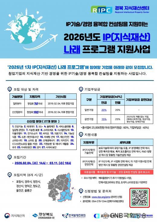 | Æ÷Ç×»ó°øÈ¸ÀǼÒ, 2026³â IP³ª·¡ ÇÁ·Î±×·¥ 1Â÷ Áö¿ø±â¾÷ ¸ðÁý - ±â¼ú°ú °æ¿µÀ» ÀÕ´Â Áö½ÄÀç»ê À¶¡¤º¹ÇÕ ÄÁ¼³ÆÃÀ¸·Î â¾÷±â¾÷ »ýÁ¸·Â Á¦°í CNB±¹È¸¹æ¼Û Àü±¹ÃѰýº»ºÎÀå ±è°Ç¿ì oprus21@naver.com |