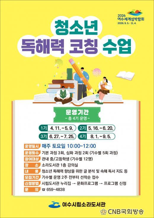 | ¿©¼ö½Ã¸³¼Ò¶óµµ¼°ü, û¼Ò³â µ¶ÇØ·Â ÄÚĪ ¼ö¾÷ ¿î¿µ -Áß¡¤°í»ý ´ë»ó ¼Óµ¶¡¤±Û ºÐ¼® ÈÆ·Ã ÇÁ·Î±×·¥¡¦4¿ùºÎÅÍ 4±â¼ö ÁøÇà CNB±¹È¸¹æ¼Û È£³²º»ºÎÀå ¿À°æÅ okt0797@naver.com |