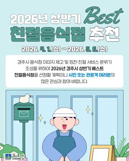 | °æÁÖ½Ã, »ó¹Ý±â ¡®º£½ºÆ® Ä£ÀýÀ½½ÄÁ¡¡¯ Ãßõ Á¢¼ö - 4¿ù 1ÀϺÎÅÍ 5¿ù 6ÀϱîÁö ½Ã¹Î‧°ü±¤°´ Âü¿© - Áö¿ª ¿Ü½Ä¾÷ ¼ºñ½º °æÀï·Â ³ôÀÌ°í ¸¸Á·µµ Çâ»ó ±â´ë CNB±¹È¸¹æ¼Û Àü±¹ÃѰýº»ºÎÀå ±è°Ç¿ì oprus21@naver.com |