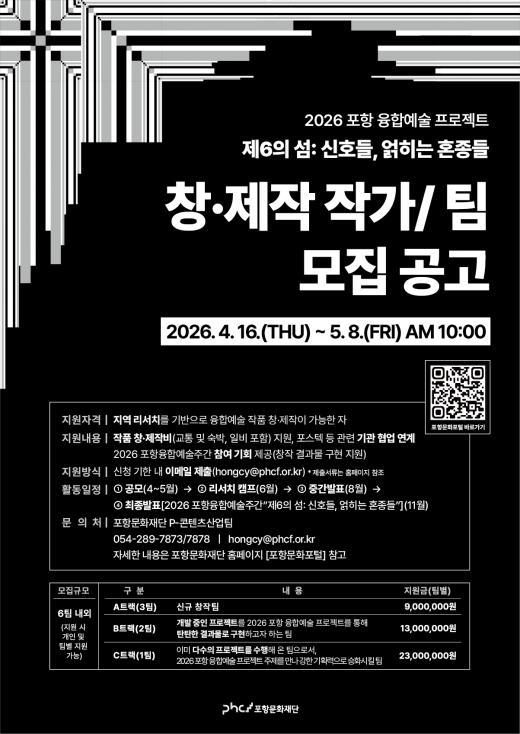¼±Á¤µÈ ÆÀ¿¡´Â Æ®·¢º°·Î °¢°¢ 900¸¸ ¿ø, 1,300¸¸ ¿ø, 2,300¸¸ ¿ø ±Ô¸ðÀÇ Ã¢¡¤Á¦ÀÛºñ°¡ Áö¿øµÈ´Ù. ¼±Á¤µÈ ÆÀÀÌ ¾à 6°³¿ù°£ ÁøÇàµÇ´Â ÇÁ·ÎÁ§Æ® °á°ú¹°Àº ¿À´Â 11¿ù °³ÃÖ ¿¹Á¤ÀÎ ¡®2026 Æ÷Ç×À¶ÇÕ¿¹¼úÁÖ°£ ¡¯Á¦6ÀÇ ¼¶: ½ÅÈ£µé, ¾ôÈ÷´Â È¥Á¾µé¡¯¿¡¼ ÃÖÁ¾ ¹ßÇ¥µÉ ¿¹Á¤ÀÌ´Ù.